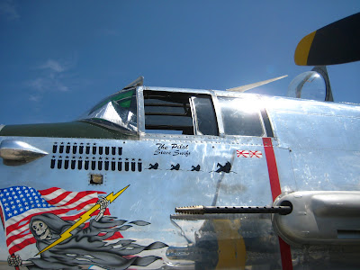 Below is Val-Halla, a P-51. It made a flight with an F-16 on its wing. Heritage Flights are the rage, apparently. She appears to be dressed in Air Defense Force colors of the late 40s and early 50s. The Buzz Number is what seems to give it away. They were painted large so if pilots got the idea to fly too low, ground observers could ID the plane and the pilot would get into trouble...at least that is the story I have read on Buzz Numbers.